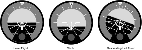 The operation of the heading indicator depends upon the principle of rigidity in space. The rotor turns in a vertical plane, and fixed to the rotor is a compass card. Since the rotor remains rigid in space, the points on the card hold the same position in space relative to the vertical plane. As the instrument case and the airplane revolve around the vertical axis, the card provides clear and accurate heading information. Because of precession, caused chiefly by friction, the heading indicator will creep or drift from a heading to which it is set. Among other factors, the amount of drift depends largely upon the condition of the instrument. If the bearings are worn, dirty, or improperly lubricated, the drift may be excessive. Bear in mind that the heading indicator is not direction-seeking, as is the magnetic compass. It is important to check the indications frequently and reset the heading indicator to align it with the magnetic compass when required. Adjusting the heading indicator to the magnetic compass heading should be done only when the airplane is in wings-level unaccelerated flight; otherwise erroneous magnetic compass readings may be obtained. The bank and pitch limits of the heading indicator vary with the particular design and make of instrument. On some heading indicators found in light airplanes, the limits are approximately 55° of pitch and 55° of bank. When either of these attitude limits is exceeded, the instrument " tumbles" or "spills" and no longer gives the correct indication until reset. After spilling, it may be reset with the caging knob. Many of the modern instruments used are designed in such a manner that they will not tumble. The Attitude Indicator The attitude indicator, with its miniature aircraft and horizon bar, displays a picture of the attitude of the airplane. The relationship of the miniature aircraft to the horizon bar is the same as the relationship of the real aircraft to the actual horizon. The instrument gives an instantaneous indication of even the smallest changes in attitude. [Figure 3-10]