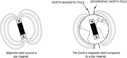 The gyro in the attitude indicator is mounted on a horizontal plane and depends upon rigidity in space for its operation. The horizon bar represents the true horizon. This bar is fixed to the gyro and remains in a horizontal plane as the airplane is pitched or banked about its lateral or longitudinal axis, indicating the attitude of the airplane relative to the true horizon. An adjustment knob is provided with which the pilot may move the miniature airplane up or down to align the miniature airplane with the horizon bar to suit the pilot's line of vision. Normally, the miniature airplane is adjusted so that the wings overlap the horizon bar when the airplane is in straight-and-level cruising flight. The pitch and bank limits depend upon the make and model of the instrument. Limits in the banking plane are usually from 100° to 110°, and the pitch limits are usually from 60° to 70°. If either limit is exceeded, the instrument will tumble or spill and will give incorrect indications until restabilized. A number of modern attitude indicators will not tumble. Every pilot should be able to interpret the banking scale. Most banking scale indicators on the top of the instrument move in the same direction from that in which the airplane is actually banked. Some other models move in the opposite direction from that in which the airplane is actually banked. This may confuse the pilot if the indicator is used to determine the direction of bank. This scale should be used only to control the degree of desired bank. The relationship of the miniature airplane to the horizon bar should be used for an indication of the direction of bank. [Figure 3-11] The attitude indicator is reliable and the most realistic flight instrument on the instrument panel. Its indications are very close approximations of the actual attitude of the airplane. MAGNETIC COMPASS Since the magnetic compass works on the principle of magnetism, it is well for the pilot to have at least a basic understanding of magnetism. A simple bar magnet has two centers of magnetism which are called poles. Lines of magnetic force flow out from each pole in all directions, eventually bending around and returning to the other pole. The area through which these lines of force flow is called the field of the magnet. For the purpose of this discussion, the poles are designated "north" and "south." If two bar magnets are placed near each other, the north pole of one will attract the south pole of the other. There is evidence that there is a magnetic field surrounding the Earth, and this theory is applied in the design of the magnetic compass. It acts very much as though there were a huge bar magnet running along the axis of the Earth which ends several hundred miles below the surface. [Figure 3-12] The lines of force have a vertical component (or pull) which is zero at the Equator but builds to 100 percent of the total force at the poles. If magnetic needles, such as the airplane magnetic compass bars, are held along these lines of force, the vertical component causes one end of the needle to dip or deflect downward. The amount of dip increases as the needles are moved closer and closer to the poles. It is this deflection or dip which causes some of the larger compass errors. The magnetic compass, which is the only direction-seeking instrument in the airplane, is simple in construction. It contains two steel magnetized needles fastened to a float around which is mounted a compass card. The needles are parallel, with their north-seeking ends pointed in the same direction. The compass card has letters for cardinal headings, and each 30° interval is represented by a number, the last zero of which is omitted. For example, 30° would appear as a 3 and 300° would appear as 30. Between these numbers, the card is graduated for each 5°. [Figure 3-13]