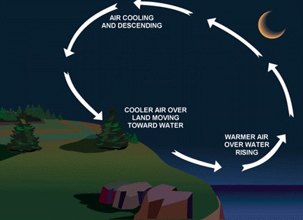 Convection Currents Certain kinds of surfaces are more effective than others in heating the air directly above them. Plowed ground, sand, rocks, and barren land give off a great deal of heat, whereas water and vegetation tend to absorb and retain heat. The uneven heating of the air causes small local circulations called "convection currents," which are similar to the general circulation just described. This may be particularly noticeable over land adjacent to a body of water. During the day, air over land becomes heated and less dense; colder air over water moves in to replace it forcing the warm air aloft and causing an on-shore wind. At night, the land cools, and the water is relatively warmer. The cool air over the land, being heavier, then moves toward the water as an off-shore wind, lifting the warmer air and reversing the circulation. [Figures 5-9 and 5-10] Convection currents cause the bumpiness experienced by pilots flying at low altitudes in warmer weather. On a low flight over varying surfaces, the pilot will encounter updrafts over pavement or barren places and downdraft over vegetation and water. Ordinarily, this can be avoided by flight at higher altitudes. When the larger convection currents form cumulus clouds, the pilot will invariably find smooth air above the cloud level. [Figure 5-11]