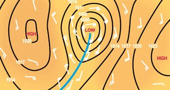 Windspeed is shown by "barbs" and/or "pennants" placed on the end of the arrow. The speed is indicated by the number of half barbs, full barbs, or pennants. Each half barb represents approximately 5 knots, each full barb indicates approximately 10 knots, and each pennant 50 knots. Thus two and one-half barbs indicate a windspeed of approximately 25 knots; a pennant and two and one-half barbs indicate a windspeed of approximately 75 knots, etc. The pilot can thus tell at a glance, the wind conditions prevailing at map time at any weather station. Pilots can obtain this information and forecasts of expected winds from all weather reporting stations. The pressure at each station is recorded on the weather map, and lines (isobars) are drawn to connect points of equal pressure. Many of the lines make complete circles to surround pressure areas marked "H" (high) or "L" (low). Isobars are quite similar to the contour lines appearing on aeronautical charts. However, instead of indicating altitude of terrain and steepness of slopes, isobars indicate the amount of pressure and steepness of pressure gradients. If the gradient (slope) is steep, the isobars will be close together, and the wind will be strong. If the gradient is gradual, the isobars will be far apart, and the wind gentle. [Figure 5-17] Isobars furnish valuable information about winds in the first few thousand feet above the surface. Close to the Earth, wind direction is modified by the contours over which it passes, and windspeed is reduced by friction with the surface. At levels 2,000 or 3,000 feet above the surface, however, the speed is greater and the direction is usually parallel to the isobars. Thus, while wind arrows on the weather map excerpt indicate wind near the surface, isobars indicate winds at slightly higher levels. [Figure 5-16] In the absence of specific information on upper wind conditions, the pilot can often make a fairly reasonable estimate of the wind conditions in the lower few thousand feet on the basis of the observed surface wind. Generally, it will be found that the wind at an altitude of 2,000 feet above the surface will veer about 20° to 40° to the right and almost double in speed. The veering will be greatest over rough terrain and least over flat surfaces. Thus, a north wind of 20 knots at the airport would be likely to change to a northeast wind of 40 knots at 2,000 feet. This subject will be reviewed later in this chapter.