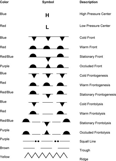 Figure 5-27 shows the development of the occluded front in greater detail. Figure 5-28 is an enlarged view of (C) in Figure 5-26, showing the cloud formations and the areas of precipitation. In figures 5-22, 5-23, and 5-25, a panel representing a surface weather map is placed below each cross-sectional view. These panels represent a bird's eye or plan view, and show how the weather conditions are recorded. A warm front is indicated by a red line, a cold front by a blue line, an occluded front by a purple line, and a stationary front by alternating red and blue dashes. The rounded and pointed projections are generally omitted from manuscript maps, but are placed on facsimile, printed, or duplicated maps to distinguish the different fronts. A frontal line on the weather map represents the position of the frontal surface on the Earth's surface. A pilot flying west at an altitude of 6,500 feet would pass through the frontal boundary about 100 miles in advance of the point where the warm front is shown, or about 25 to 50 miles to the rear of the line on the map representing the cold front. Figure 5-29 is a section of a surface weather map as transmitted on facsimile. It shows a low pressure center with warm, cold, and occluded fronts. The preceding discussion categorizes weather with types of fronts. However, weather with a front depends more on the characteristics of the conflicting air masses than on the type of front. A pilot should not attempt to determine expected weather from fronts and pressure centers on the surface chart alone. The pilot must rely heavily on other charts, reports, and forecasts which are discussed in the next section of this chapter. AVIATION WEATHER REPORTS, FORECASTS, AND WEATHER CHARTS A few reports and forecasts that are available to pilots were discussed briefly in previous portions of this chapter. This section will discuss these reports and forecasts in greater detail along with weather charts. Although pilots may often receive a telephone briefing, they should be able to read and interpret these reports, forecasts, and charts. Printed aviation data may be found at the National Weather Service Office, flight service stations, as well as reports generated through a direct user access terminal (DUAT) system. Although this section contains a great deal of information about reports, forecasts, and charts, for further information, reference should be made to AC 00-45 (latest revision), Aviation Weather Services, which is for sale by the Superintendent of Documents, U.S. Government Printing Office, Washington, DC 20402.