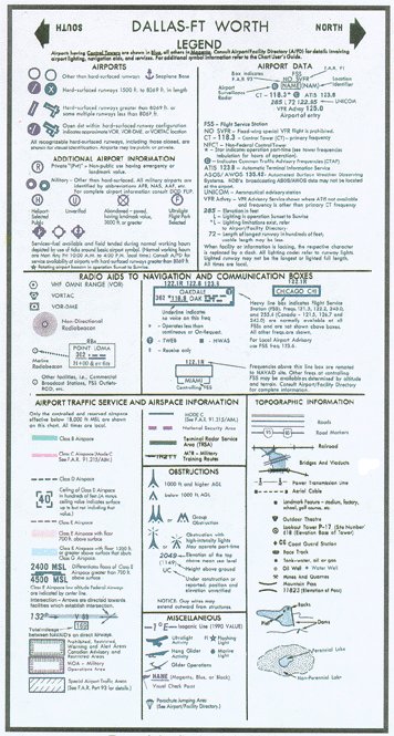 A free catalog listing aeronautical charts and related publications including prices and instructions for ordering is available upon request from: NOAA Distribution Branch (N/CG33) National Ocean Survey Riverdale, MD 20737-1199 Telephone: (301) 436-6990 Sectional Charts Sectional charts are the most common charts used by pilots today. The charts have a scale of 1:500,000 (1 inch = 6.86 nautical miles or 8 statute miles) which allows for more detailed information to be included on the chart. The charts provide an abundance of information, including airport data, navigational aids, airspace, and topography etc. Figure 8-1 is an excerpt from the legend of a sectional chart. By referring to the chart legend, a pilot can interpret most of the information on the chart. A pilot should also check the chart for other legend information which includes air traffic control frequencies and information on airspace. These charts are revised semiannually except for some areas outside the contiguous United States where they are revised annually. Visual Flight Rule (VFR) Terminal Area Charts Visual flight rule terminal area charts are helpful when flying in or near Class B airspace. They have a scale of 1:250,000 (1 inch =3.43 nautical miles or 4 statute miles). These charts provide a more detailed display of topographical information and are revised semiannually, except for several Alaskan and Caribbean charts. World Aeronautical Charts World aeronautical charts are designed to provide a standard series of aeronautical charts, covering land areas of the world, at a size and scale convenient for navigation by moderate speed aircraft. They are produced at a scale of 1:1,000,000 (1 inch = 13.7 nautical miles (NM) or 16 statute miles). These charts are similar to sectional charts and the symbols are the same except there is less detail due to the smaller scale. These charts are revised annually except several Alaskan charts and the Mexican/Caribbean charts which are revised every 2 years.