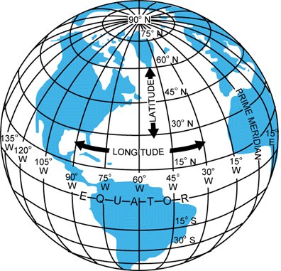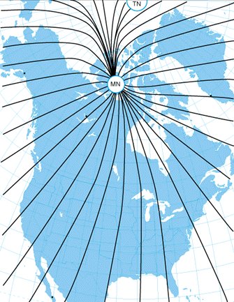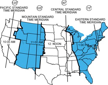 Meridians of longitude are drawn from the North Pole to the South Pole and are at right angles to the Equator. The "Prime Meridian" which passes through Greenwich, England, is used as the zero line from which measurements are made in degrees east and west to 180°. The 48 conterminous states of the United States are between 67° and 125° W. Longitude. The arrows in figure 8-2 labeled "LONGITUDE" point to lines of longitude. Any specific geographical point can thus be located by reference to its longitude and latitude. Washington, DC for example, is approximately 39° N. latitude, 77° W. longitude. Chicago is approximately 42° N. latitude, 88° W. longitude. Time Zones The meridians are also useful for designating time zones. A day is defined as the time required for the Earth to make one complete revolution of 360°. Since the day is divided into 24 hours, the Earth revolves at the rate of 15° an hour. Noon is the time when the Sun is directly above a meridian; to the west of that meridian is forenoon, to the east is afternoon. The standard practice is to establish a time zone for each 15° of longitude. This makes a difference of exactly 1 hour between each zone. In the United States, there are four time zones. The time zones are Eastern (75° ), Central (90°), Mountain (105°), and Pacific (120°). The dividing lines are somewhat irregular because communities near the boundaries often find it more convenient to use time designations of neighboring communities or trade centers. Figure 8-3 shows the time zones in the United States. When the Sun is directly above the 90th meridian, it is noon Central Standard Time. At the same time, it will be 1 p.m. Eastern Standard Time, 11 a.m. Mountain Standard Time, and 10 a.m. Pacific Standard Time. When "daylight saving" time is in effect, generally between the last Sunday in April and the last Sunday in October, the Sun is directly above the 75th meridian at noon, Central Daylight Time. These time zone differences must be taken into account during long flights eastward -- especially if the flight must be completed before dark. Remember, an hour is lost when flying eastward from one time zone to another, or perhaps even when flying from the western edge to the eastern edge of the same time zone. Determine the time of sunset at the destination by consulting the flight service stations (AFSS/FSS) or National Weather Service and take this into account when planning an eastbound flight.