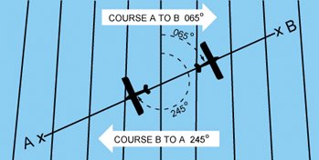 Because meridians converge toward the poles, course measurement should be taken at a meridian near the midpoint of the course rather than at the point of departure. The course measured on the chart is known as the true course. This is the direction measured by reference to a meridian or true north. It is the direction of intended flight as measured in degrees clockwise from true north. As shown in figure 8-5, the direction from A to B would be a true course of 065°, whereas the return trip (called the reciprocal) would be a true course of 245°.