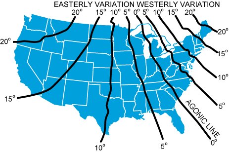 On the west coast of the United States, the compass needle points to the east of true north; on the east coast, the compass needle points to the west of true north. Zero degree variation exists on the agonic line which runs roughly through Lake Michigan, the Appalachian Mountains, and off the coast of Florida, where magnetic north and true north coincide. [Compare figures 8-7 and 8-8]