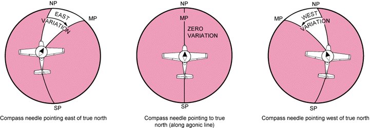 The true heading is the direction in which the nose of the airplane points during a flight when measured in degrees clockwise from true north. Usually, it is necessary to head the airplane in a direction slightly different from the true course to offset the effect of wind. Consequently, numerical value of the true heading may not correspond with that of the true course. This will be discussed more fully in subsequent sections in this chapter. For the purpose of this discussion, assume a no-wind condition exists under which heading and course would coincide. Thus, for a true course of 065°, the true heading would be 065°. To use the compass accurately, however, corrections must be made for magnetic variation and compass deviation. Variation Variation is the angle between true north and magnetic north. It is expressed as east variation or west variation depending upon whether magnetic north (MN) is to the east or west of true north (TN), respectively. The north magnetic pole is located close to 71° N. latitude, 96° W. longitude and is about 1,300 miles from the geographic or true north pole, as indicated in figure 8-6. If the Earth were uniformly magnetized, the compass needle would point toward the magnetic pole, in which case the variation between true north (as shown by the geographical meridians) and magnetic north (as shown by the magnetic meridians) could be measured at any intersection of the meridians. Actually, the Earth is not uniformly magnetized. In the United States the needle usually points in the general direction of the magnetic pole, but it may vary in certain geographical localities by many degrees. Consequently, the exact amount of variation at thousands of selected locations in the United States has been carefully determined. The amount and the direction of variation, which change slightly from time to time, are shown on most aeronautical charts as broken magenta lines, called isogonic lines, which connects points of equal magnetic variation. (The line connecting points at which there is no variation between true north and magnetic north is the agonic line.) An isogonic chart is shown in figure 8-6. Minor bends and turns in the isogonic and agonic lines are caused by unusual geological conditions affecting magnetic forces in these areas.
