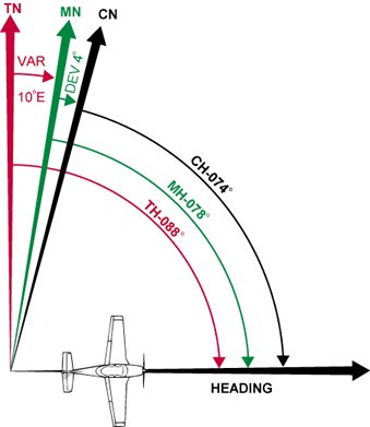 Because courses are measured in reference to geographical meridians which point toward true north, and these courses are maintained by reference to the compass which points along a magnetic meridian in the general direction of magnetic north, the true direction must be converted into magnetic direction for the purpose of flight. This conversion is made by adding or subtracting the variation which is indicated by the nearest isogonic line on the chart. The true heading, when corrected for variation, is known as magnetic heading. If the variation is shown as "9° E," this means that magnetic north is 9° east of true north. If a true heading of 360° is to be flown, 9° must be subtracted from 360°, which results in a magnetic heading of 351°. To fly east, a magnetic heading of 081° (090° - 9°) would be flown. To fly south, the magnetic heading would be 171° (180° - 9°). To fly west, it would be 261° (270° - 9° ). To fly a true heading of 060°, a magnetic heading of 051° (060° - 9°) would be flown. Remember, to convert true course or heading to magnetic course or heading, note the variation shown by the nearest isogonic line. If variation is west, add; if east, subtract. One method for remembering whether to add or subtract variation is the phrase "east is least (subtract) and west is best (add)." Deviation Determining the magnetic heading is an intermediate step necessary to obtain the correct compass reading for the flight. To determine compass heading, a correction for deviation must be made. Because of magnetic influences within the airplane such as electrical circuits, radio, lights, tools, engine, magnetized metal parts, etc., the compass needle is frequently deflected from its normal reading. This deflection is deviation. The deviation is different for each airplane, and it also may vary for different headings in the same airplane. For instance, if magnetism in the engine attracts the north end of the compass, there would be no effect when the plane is on a heading of magnetic north. On easterly or westerly headings, however, the compass indications would be in error, as shown in figure 8-9. Magnetic attraction can come from many other parts of the airplane; the assumption of attraction in the engine is merely used for the purpose of illustration.