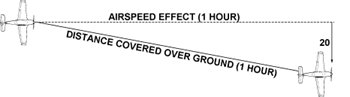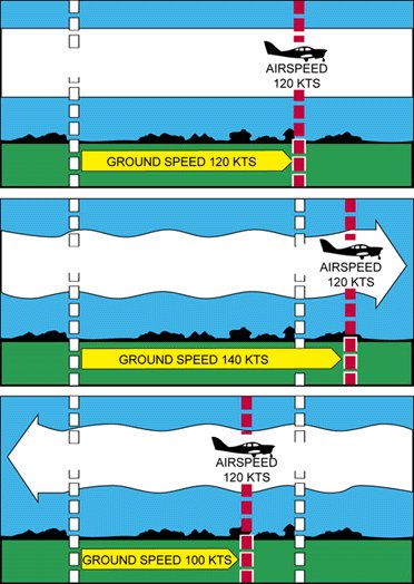 Assuming no correction is made for wind effect, if the airplane is heading eastward at 120 knots, and the air mass moving southward at 20 knots, the airplane at the end of 1 hour will be 120 miles east of its point of departure because of its progress through the air. It will be 20 miles south because of the motion of the air. Under these circumstances, the airspeed remains 120 knots, but the groundspeed is determined by combining the movement of the airplane with that of the air mass. Groundspeed can be measured as the distance from the point of departure to the position of the airplane at the end of 1 hour. The groundspeed can be computed by the time required to fly between two points a known distance apart. It also can be determined before flight by constructing a wind triangle, which will be explained later in this chapter. [Figure 8-13]