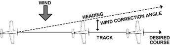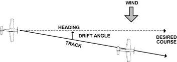 The direction in which the plane is pointing as it flies is heading. Its actual path over the ground, which is a combination of the motion of the airplane and the motion of the air, is track. The angle between the heading and the track is drift angle. If the airplane's heading coincides with the true course and the wind is blowing from the left, the track will not coincide with the true course. The wind will drift the airplane to the right, so the track will fall to the right of the desired course or true course. [Figure 8-14]