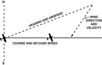 EFFECT OF WIND The preceding discussion explained how to measure a true course on the aeronautical chart and how to make corrections for variation and deviation, but one important factor has not been considered—wind. As discussed in the study of the atmosphere, wind is a mass of air moving over the surface of the Earth in a definite direction. When the wind is blowing from the north at 25 knots, it simply means that air is moving southward over the Earth's surface at the rate of 25 NM in 1 hour. Under these conditions, any inert object free from contact with the Earth will be carried 25 NM southward in 1 hour. This effect becomes apparent when clouds, dust, toy balloons, etc., are observed being blown along by the wind. Obviously, an airplane flying within the moving mass of air will be similarly affected. Even though the airplane does not float freely with the wind, it moves through the air at the same time the air is moving over the ground, thus is affected by wind. Consequently, at the end of 1 hour of flight, the airplane will be in a position which results from a combination of these two motions: