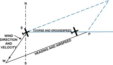 Roads shown on the chart are primarily the well traveled roads or those most apparent when viewed from the air. New roads and structures are constantly being built, and may not be shown on the chart until the next chart is issued. Some structures, such as antennas may be difficult to see. Sometimes TV antennas are grouped together in an area near a town. They are supported by almost invisible guy wires. Never approach an area of antennas less than 500 feet above the tallest one. Most of the taller structures are marked with strobe lights to make them more visible to a pilot. However, some weather conditions or background lighting may make them difficult to see. Aeronautical charts display the best information available at the time of printing, but a pilot should be cautious for new structures or changes that have occurred since the chart was printed. DEAD RECKONING Dead reckoning is navigation solely by means of computations based on time, airspeed, distance, and direction. The products derived from these variables, when adjusted by windspeed and velocity, are heading and groundspeed . The predicted heading will guide the airplane along the intended path and the groundspeed will establish the time to arrive at each checkpoint and the destination. The word "dead" in dead reckoning is actually derived from "ded," or deduced reckoning. Except for flights over water, dead reckoning is usually used with pilotage for cross-country flying. The heading and groundspeed as calculated is constantly monitored and corrected by pilotage as observed from checkpoints. The Wind Triangle or Vector Analysis If there is no wind, the airplane's ground track will be the same as the heading and the groundspeed will be the same as the true airspeed. Only on rare occasions does this condition exist. A wind triangle, the pilot's version of vector analysis, is the backbone of dead reckoning. The wind triangle is a graphic explanation of the effect of wind upon flight. Groundspeed, heading, and time for any flight can be determined by using the wind triangle. It can be applied to the simplest kind of cross-country flight as well as the most complicated instrument flight. The experienced pilot becomes so familiar with the fundamental principles that estimates can be made which are adequate for visual flight without actually drawing the diagrams. The beginning student, however, needs to develop skill in constructing these diagrams as an aid to the complete understanding of wind effect. Either consciously or unconsciously, every good pilot thinks of the flight in terms of wind triangle. If a flight is to be made on a course to the east, with a wind blowing from northeast, the airplane must be headed somewhat to the north of east to counteract drift. This can be represented by a diagram as shown in figure 8-17. Each line represents direction and speed. The long dotted line shows the direction the plane is heading, and its length represents the airspeed for 1 hour. The short dotted line at the right shows the wind direction, and its length represents the wind velocity for 1 hour. The solid line shows the direction of the track, or the path of the airplane as measured over the Earth, and its length represents the distance traveled in 1 hour, or the groundspeed.