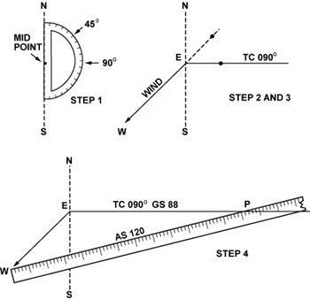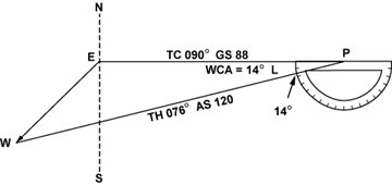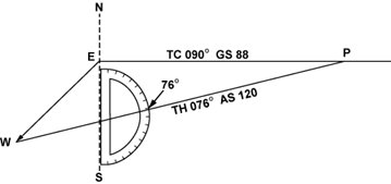 Place the protractor with the base resting on the vertical line and the curved edge facing east. At the center point of the base, make a dot labeled " E" (point of departure), and at the curved edge, make a dot at 90° (indicating the direction of the true course) and another at 45° (indicating wind direction). With the ruler, draw the true course line from E, extending it somewhat beyond the dot by 90°, and labeling it "TC 090°." Next, align the ruler with E and the dot at 45°, and draw the wind arrow from E, not toward 045°, but downwind in the direction the wind is blowing, making it 40 units long, to correspond with the wind velocity of 40 knots. Identify this line as the wind line by placing the letter "W" at the end to show the wind direction. Finally, measure 120 units on the ruler to represent the airspeed, making a dot on the ruler at this point. The units used may be of any convenient scale or value (such as 1/4 inch = 10 knots), but once selected, the same scale must be used for each of the linear movements involved. Then place the ruler so that the end is on the arrowhead (W) and the 120 knot dot intercepts the true course line. Draw the line and label it " AS 120." The point "P" placed at the intersection, represents the position of the airplane at the end of 1 hour. The diagram is now complete. The distance flown in 1 hour (groundspeed) is measured as the numbers of units on the true course line (88 nautical miles per hour or 88 knots). The true heading necessary to offset drift is indicated by the direction of the airspeed line which can be determined in one of two ways: