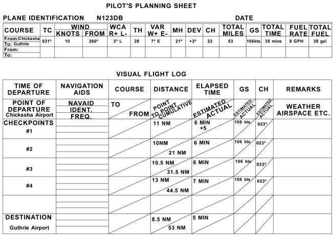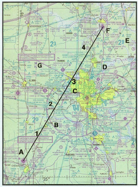 Steps in Charting the Course The following is a suggested sequence for arriving at the pertinent information for the trip. As information is determined, it may be noted as illustrated in the example of a flight log in figure 8-23. Where calculations are required, the pilot may use a mathematical formula or a manual or electronic flight computer. If unfamiliar with how to use a manual or electronic computer competently, it would be advantageous to read the operation manual and work several practice problems at this point. First draw a line from Chickasha Airport (point A) directly to Guthrie Airport (point F). The course line should begin at the center of the airport of departure and end at the center of the destination airport. If the route is direct, the course line will consist of a single straight line. If the route is not direct, it will consist of two or more straight line segments -- for example, a VOR station which is off the direct route, but which will make navigating easier, may be chosen (radio navigation is discussed later in this chapter). Appropriate checkpoints should be selected along the route and noted in some way. These should be easy-to-locate points such as large towns, large lakes and rivers, or combinations of recognizable points such as towns with an airport, towns with a network of highways and railroads entering and departing, etc. Normally, choose only towns indicated by splashes of yellow on the chart. Do not choose towns represented by a small circle -- these may turn out to be only a half-dozen houses. (In isolated areas, however, towns represented by a small circle can be prominent checkpoints.) For this trip, four checkpoints have been selected. Checkpoint 1 consists of a tower located east of the course and can be further identified by the highway and railroad track which almost parallels the course at this point. Checkpoint 2 is the obstruction just to the west of the course and can be further identified by Will Rogers Airport which is directly to the east. Checkpoint 3 is Wiley Post Airport which the aircraft should fly directly over. Checkpoint 4 is a private non-surfaced airport to the west of the course and can be further identified by the railroad track and highway to the east of the course. The course and areas on either side of the planned route should be checked to determine if there is any type of airspace with which the pilot should be concerned or which has special operational requirements. For this trip, it should be noted that the course will pass through a segment of the Class C airspace surrounding Will Rogers Airport where the floor of the airspace is 2,500 feet mean sea level (MSL) and the ceiling is 5,300 feet MSL (point B). Also, there is Class D airspace from the surface to 3,800 feet MSL surrounding Wiley Post Airport (point C) during the time the control tower is in operation. Study the terrain and obstructions along the route. This is necessary to determine the highest and lowest elevations as well as the highest obstruction to be encountered so that an appropriate altitude which will conform to part 91 regulations can be selected. If the flight is to be flown at an altitude more than 3,000 feet above the terrain, conformance to the cruising altitude appropriate to the direction of flight is required. Check the route for particularly rugged terrain so it can be avoided. Areas where a takeoff or landing will be made should be carefully checked for tall obstructions. TV transmitting towers may extend to altitudes over 1,500 feet above the surrounding terrain. It is essential that pilots be aware of their presence and location. For this trip, it should be noted that the tallest obstruction is part of a series of antennas with a height of 2,749 feet MSL (point D). The highest elevation should be located in the northeast quadrant and is 2,900 feet MSL (point E). Since the wind is no factor and it is desirable and within the airplane's capability to fly above the Class C and D airspace to be encountered, an altitude of 5,500 feet MSL will be chosen. This altitude also gives adequate clearance of all obstructions as well as conforms to the part 91 requirement to fly at an altitude of odd thousand plus 500 feet when on a magnetic course between 0 and 179°. Next, the pilot may want to measure the total distance of the course as well as the distance between checkpoints. The total distance is 53 NM and the distance between checkpoints is as noted on the flight log in figure 8-23. After determining the distance, the true course should be measured. If using a plotter, follow the directions on the plotter. The true course is 031°. Once the true heading is established, the pilot can determine the compass heading. This is done by following the formula given earlier in this chapter. The formula is: