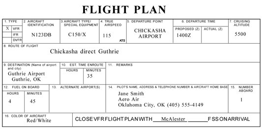 Filing a flight plan is not required by regulations; however, it is a good operating practice, since the information contained in the flight plan can be used in search and rescue in the event of an emergency. Flight plans can be filed in the air by radio, but it is best to file a flight plan either in person at the FSS or by phone just before departing. After takeoff, contact the FSS by radio and give them the takeoff time so the flight plan can be activated. When a VFR flight plan is filed, it will be held by the FSS until 1 hour after the proposed departure time and then canceled unless: the actual departure time is received; or a revised proposed departure time is received; or at the time of filing, the FSS is informed that the proposed departure time will be met, but actual time cannot be given because of inadequate communication. The FSS specialist who accepts the flight plan will not inform the pilot of this procedure, however. Figure 8-24 shows the flight plan form a pilot files with the Flight Service Station. When filing a flight plan by telephone or radio, give the information in the order of the numbered spaces. This enables the FSS specialist to copy the information more efficiently. Most of the spaces are either self-explanatory or nonapplicable to the VFR flight plan (such as item 13). However, some spaces may need explanation. Item 3 asks for the aircraft type and special equipment. An example would be C-150/X which means the aircraft has no transponder. A listing of special equipment codes is listed in the Aeronautical Information Manual. Item 6 asks for the proposed departure time in Universal Coordinated Time (indicated by the "Z"). Item 7 asks for the cruising altitude. Normally "VFR" can be entered in this block, since the pilot will choose a cruising altitude to conform to FAA regulations. Item 8 asks for the route of flight. If the flight is to be direct, enter the word "direct;" if not, enter the actual route to be followed such as via certain towns or navigation aids.
