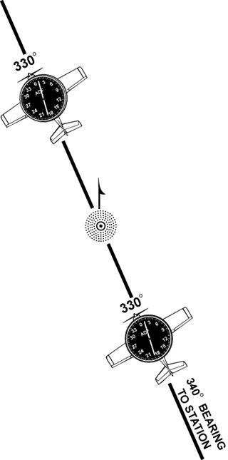To determine the magnetic bearing "FROM" the station, 180° is added to or subtracted from the magnetic bearing to the station. This is the reciprocal bearing and is used when plotting position fixes. Keep in mind that the needle of fixed azimuth points to the station in relation to the nose of the aircraft. If the needle is deflected 30° to the left or a relative bearing of 330°, this means that the station is located 30° left. If the aircraft is turned left 30°, the needle will move to the right 30° and indicate a relative bearing of 0° or the aircraft will be pointing toward the station. If the pilot continues flight toward the station keeping the needle on 0°, the procedure is called homing to the station. If a crosswind exists, the ADF needle will continue to drift away from zero. To keep the needle on zero, the aircraft must be turned slightly resulting in a curved flightpath to the station. Homing to the station is a common procedure, but results in drifting downwind, thus lengthening the distance to the station. Tracking to the station requires correcting for wind drift and results in maintaining flight along a straight track or bearing to the station. When the wind drift correction is established, the ADF needle will indicate the amount of correction to the right or left. For instance, if the magnetic bearing to the station is 340°, a correction for a left crosswind would result in a magnetic heading of 330°, and the ADF needle would indicate 10° to the right or a relative bearing of 010°. [Figure 8-30]